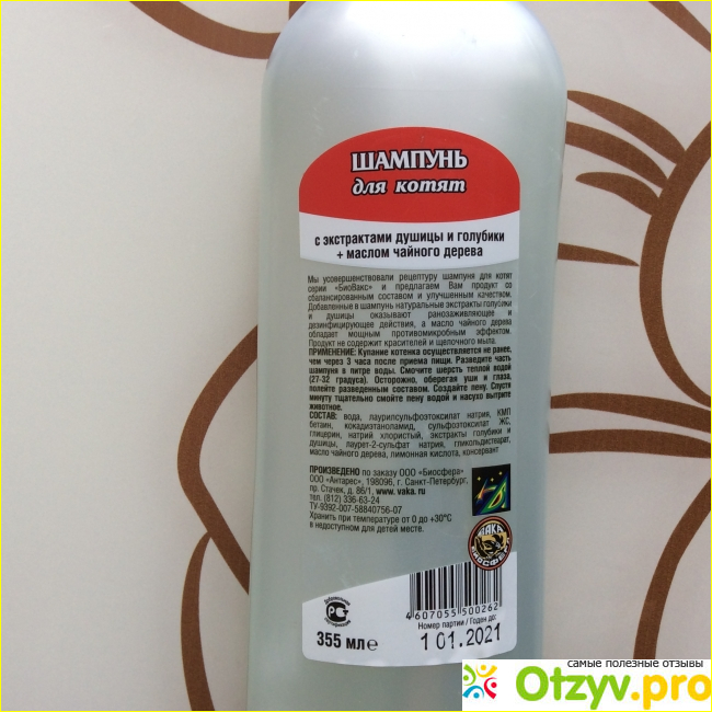 У шампуня очень лаконичный дизайн, совершенно не вычурный, собственно говоря ценник у шампуня небольшой, поэтому это отражается на дизайне. Флакончик пластиковый, вмещает в себя 355 мл шампуня. Учитывая, что шампунь предназначен для котёнка, этого объема очень много.