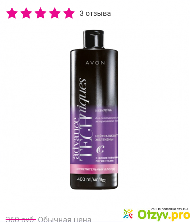 Огромный плюс - это, конечно же, цена. 400 мл шампуня стоят всего 220 рублей. За аналогичный объем других брендов можно отдать и 600, и 1000 и не получить нужного эффекта. Пробовала и пенки для волос, и другие шампуни, и бальзамы, и уже пришла к выводу, что все эти средства - профанация. Но все же Avon дает совершенно другой результат. Советую подержать его на волосах, как бальзам, минуты три.