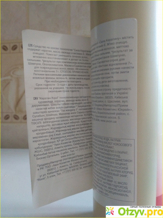На внутренней части имеется описание состав. К тому же, средство на основе технологии "сила кератина" содержит кератин, масло авокадо и витамин E.