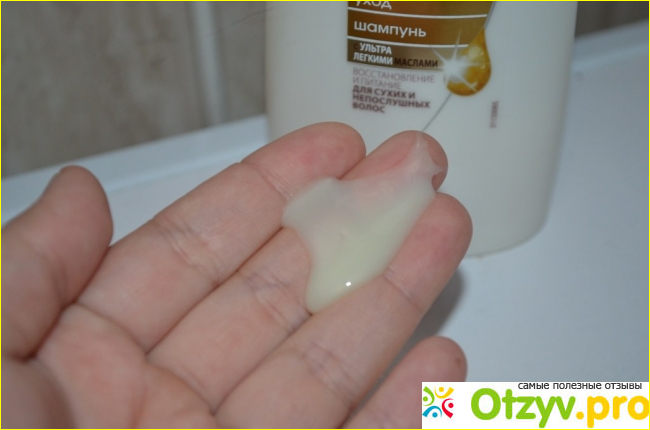 Шампунь нежного белого цвета. Текстура не очень жидкая. Быстро и легко пенится, тем самым хорошо промывая волосы.