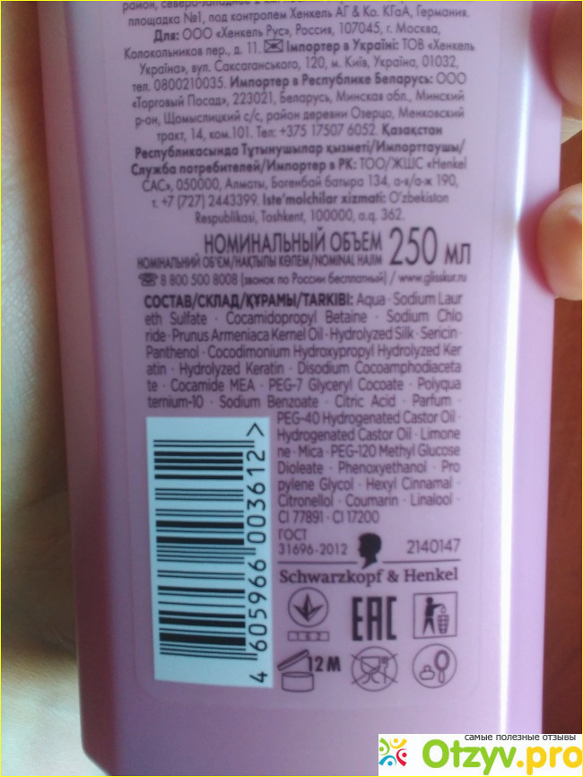 На флакончике с обратной стороны есть наклейка, где производитель указывает подробную информацию и о себе самом и о своём продукте. Изготовитель обещает при использовании данного средства волосы мягкие, как шёлк.