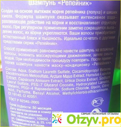 А вот теперь о самом интересном, рассмотрим составляющие компоненты этого чудо средства. На первом месте производитель указывает: вода, бетаин, глюкозид, какой-то поликватериум, не знаю точно что это за вещество, и только потом репейник. Удивительно, я ожидала его увидеть если не на первом месте, то хотя бы на третьем, но увы, пятое место! После него крапива, хмель, Д-пантенол, кокамид, календула, пихта, витамин Е, и парфюмированные отдушки и спирт.