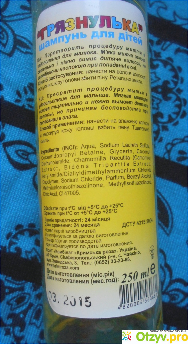 Если глянуть на обратную сторону пузырька, то можно почитать много интересной информации- о самом шапуне Грязнулька, о его составе, найти контакты производителя, срок годности и другое. Меня порадовала фраза о безопасном мытье волос даже при попадании в глаза, но немного расстроил состав.