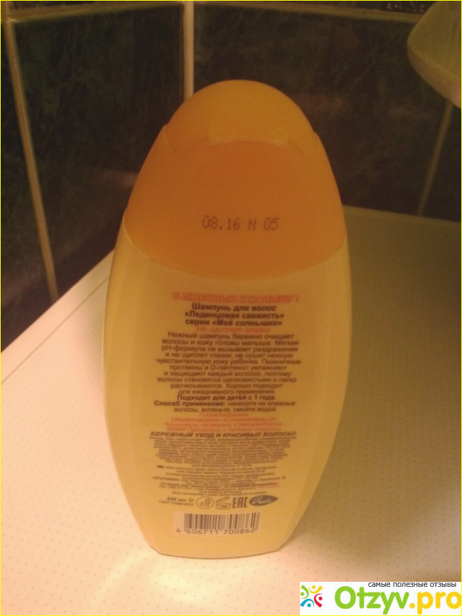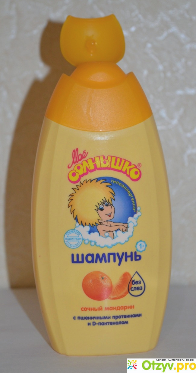 Детская шампунь "Мое солнышко" сочный мандарин с пшеничными протеинами и D-пантенолом имеет яркую привлекательную упаковку, которая так нравится деткам! Шампунь проверена и рекомендована педиатрами, об этом говорит эмблема на главной стороне флакона.