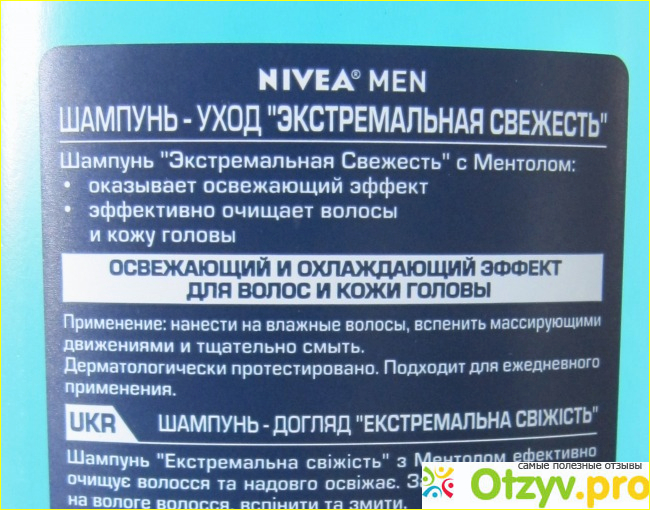 Шампунь имеет приятный голубой цвет, хорошо пенится и обладает свежим ментоловым ароматом. О способе применения и оказываемом эффекте можно прочитать с обратной стороны бутылки на русском, украинском и казахском языках.