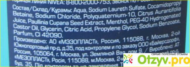 Здесь же находится и информация о составе шампуня, правда, только на английском языке. Так же указан производитель: АО "Мэзопласт" г. Москва.