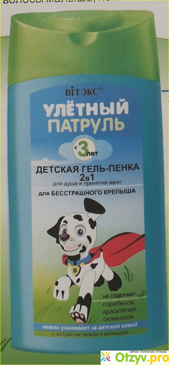 И хочу поделиться с вами. Приобрела я «Детский шампунь для волос «Улётный патруль». Это серия для мальчиков. И сразу хочу отметить название, оно прикольное и интересное. Под стать ему и оформление этикетки, «далматинец-супергерой». Производит данный шампунь белорусская фирма «Витэкс». И шампунь подходит для деток от трех лет, он специально для них и разработан. В составе данного шампуня нет парабенов, красителей и силиконов.
