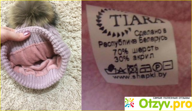 И такую шапку я нашла. Изделие оказалось с логотипом "Тиара". Продавец – консультант объяснила, что это наименование трикотажного объединения, находящегося в Белоруссии. На внутренней стороне шапки вшита тканевая этикетка с логотипом производителя и с указанием состава.