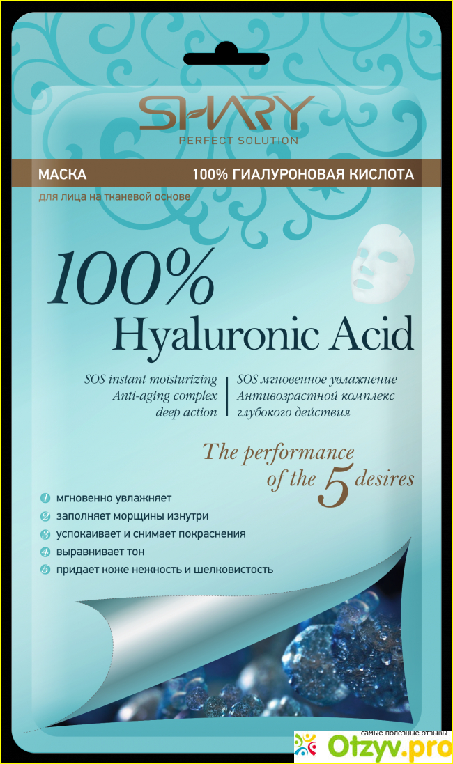 Тканевая маска SHERY 100% гиалуроновая кислота. Это антивозрастной комплекс глубокого действия, быстрое, мгновенное увлажнение. В своем составе она имеет комплекс витаминов В3, В5, В6, С, Е.