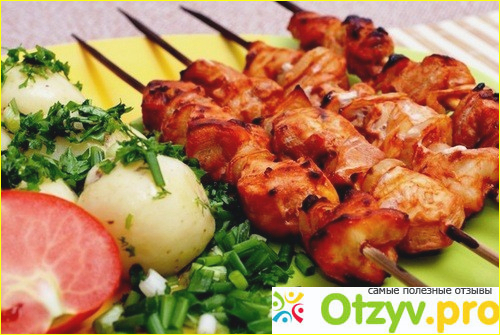 Мужчина подаёт мне наколотые на деревянный шампур кусочки подрумяненные куриного мяса на пластиковой разовой тарелке, в которую на отдельной стороне наливает красного томатного кетчупа "Балтиморъ" и раскладывает дольки свежих помидора и огурчика мелких сортов! В дополнение подаёт кусочек ржаного хлеба, разовую вилку и салфетку!