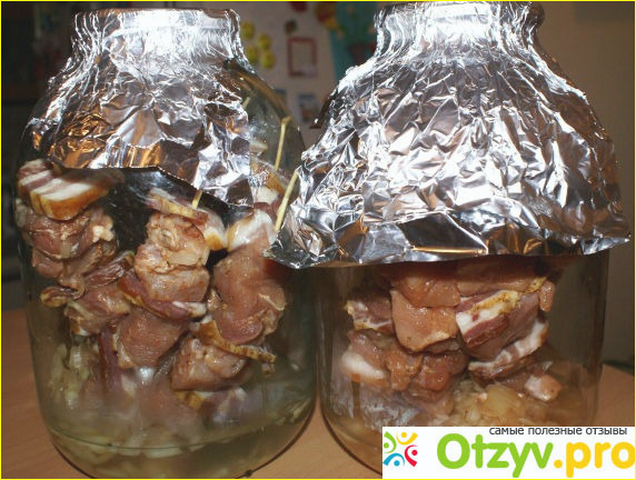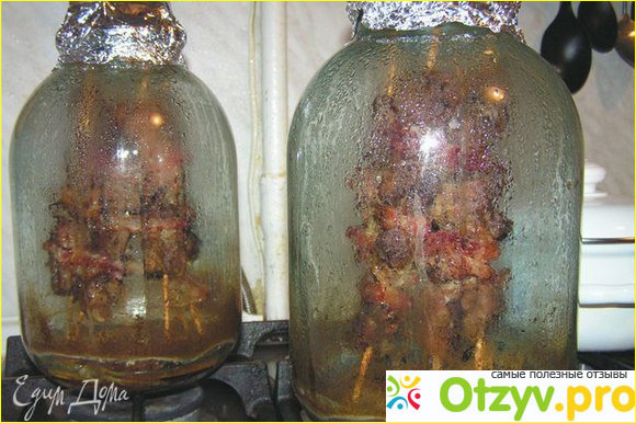 Банки нужно хорошенько вытереть насухо, чтоб они не лопнули в духовке. Бутыль с шашлыком закрывается фольгой и ставиться в духовку. Это блюдо готовиться где-то один часик при сто восьмидесяти градусах .