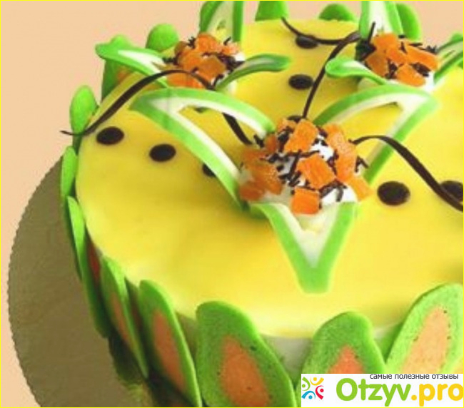 Верхний корж полит слоем нежнейшего белого шоколада и украшен фруктовыми цукатами. Калорийность 100 граммового кусочка торта находится в пределах 305 ккал.