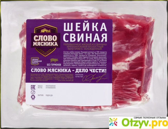Кусок охлажденной шейки Слово мясника купила первый раз, хотя другую продукцию фирмы уже пробовала. Вес кусков разный, но все плюс минус кило. Порадовало, что в магазине можно было выбрать со свежей датой изготовления, несмотря на вакуум.