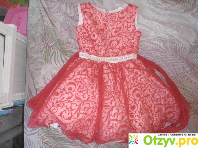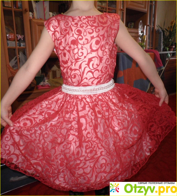 Верх платья кружева плотного качества, они накрахмалены. Внизу три дополнительных юбки, тоненькие, из подкладочной ткани. Одна из них из фатина. Платье выглядит пышно, элегантно, неотразимо и просто великолепно. Его заметно сразу. Все остальные цвета меркнут, глядя на на такой яркий оттенок.