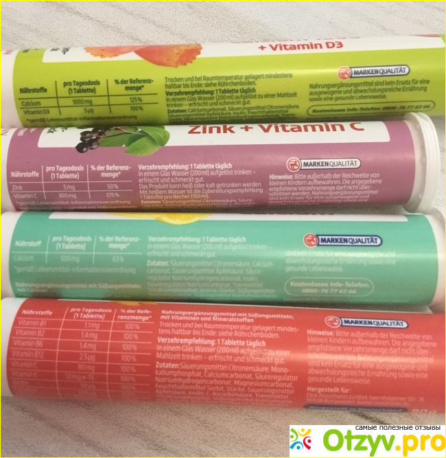 Витамины от Россман рекомендую однозначно, их можно заказать из Германии по демократичной цене, или купит у нас в некоторых магазинах, немецкое качество не вызывает никаких сомнений, сделаны они с учетом всех требований для внутреннего рынка, разнообразие вкусов и состава позволяет подобрать оптимальный вариант для себя. Детям тоже очень нравится эффект «шипучки» и фруктовый вкус, по этому пьют они из с большим удовольствием.