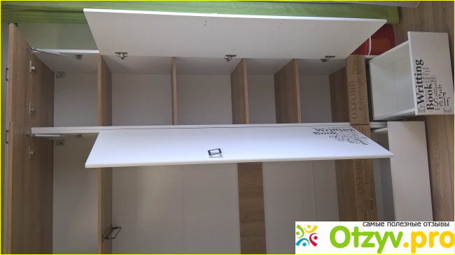 Отдельно открывается антресоль, дальше располагается 4 небольших, но удобных полок и в самом низу хороший выдвижной ящик. Доводчиков в стандартной комплектации нет.