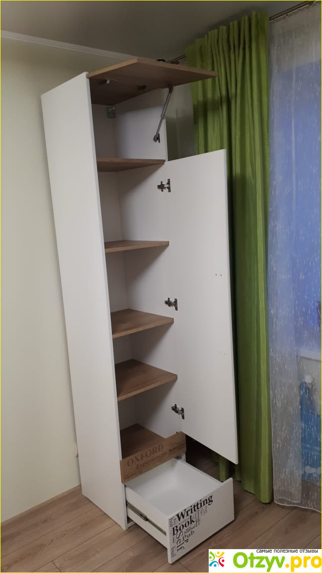 При сборке обнаружился большой минус, тонкие боковые стенки у шкафа и слишком большие отверстия, сделаны производителем, при установке специальных штифтов произошел небольшой пролом стенок. Хорошо, что он находится внутри шкафа и незаметен при эксплуатации.