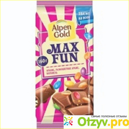 Фирма " Alpen Gold " славится своим шоколадом, в ассортименте огромнейшее разнообразие вкусов и начинок. Не так давно появились новые виды шоколада Max Fun , большие по объёму плитки с необычными составляющими. Отличаются от стандартного размера плитки -90 грамм, нам предлагают 160 грамм.