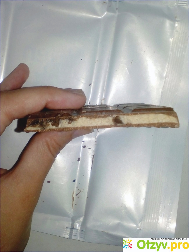 Если разломить шоколадку, то видна начинка с тем же печеньем. Она видимо и имитирует арахисовую пасту. Только вот вкус меня расстроил, вернее не понравился вообще. Шоколадка очень и очень сладкая, невозможно не запивать ее чем-то несладким. при этом вкус вообще не напоминает арахисовую пасту или арахис. Не знаю что там.. но явно не то, что заявлено. Хотя что я удивляюсь.. шоколад не с арахисовой пастой, а с ее вкусом. Не куплю больше.