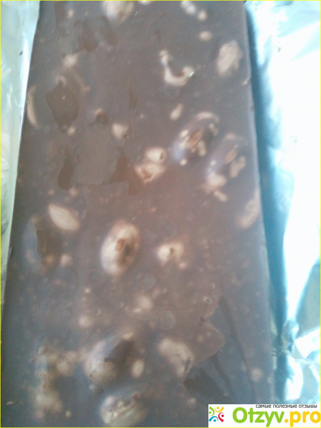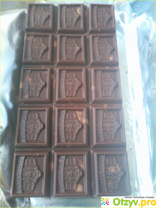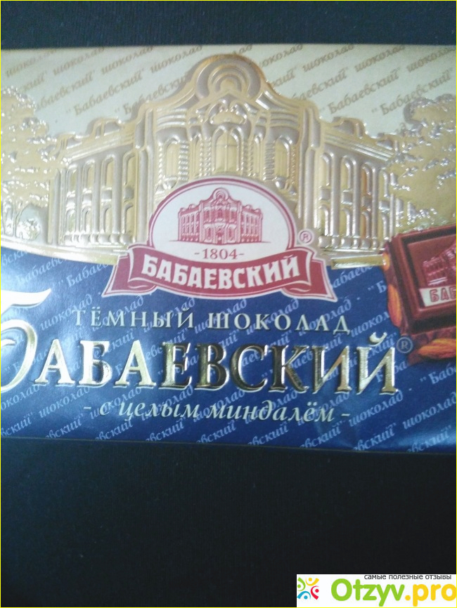 Если перевернуть плитку шоколада "Бабаевский" на ту сторону, которая не имеет узоров, а имеет вид сплошного ровного образования, то на этом образовании можно увидеть и почувствовать рукой, как эти кусочки миндаля аппетитно выпукло проглядывают сквозь структуру этого богатого цвета тёмного шоколада!