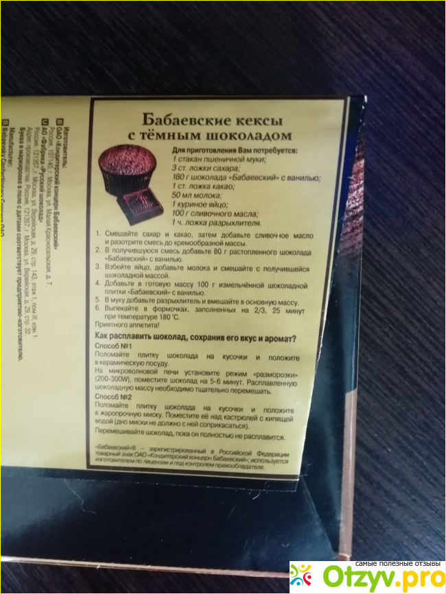 На обратной стороне можно ознакомиться не только с составом, данным о производителе, но и с рецептом десерта с использованием "Бабаевского" шоколада.