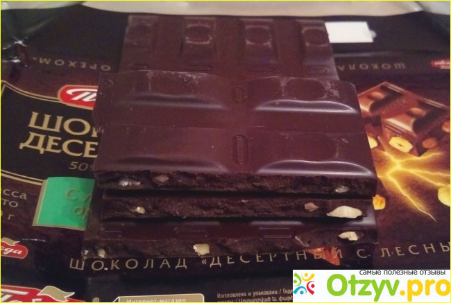 На вкус шоколад немного горький, как и положено плитке в содержанием какао. Он в меру сладкий, не приторный. Ощущения на языке приятные, шоколад начинает подтаивать, а орешки хрустеть.
