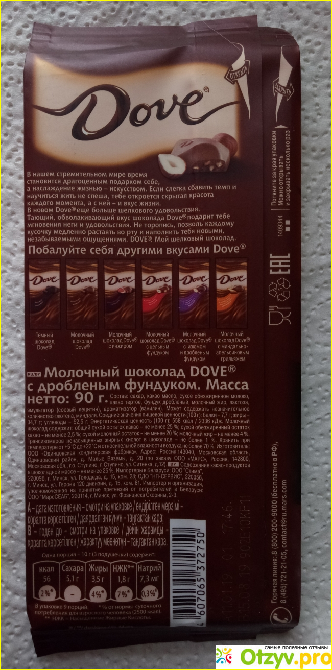 Подан сам шоколад Dove довольно таки презентабельно, с таким не стыдно и к учителю сходить, так сказать извиниться за двойку своего чада, и на стол преподнести, если незваным гостем ворвался к знакомым, у которых шаром дома покати, а тебе чая сладенького захотелось бы испить. В любом случае, выглядит плитка неплохо, да и в тандеме с бутылочкой чего-нибудь горячительного вполне достойно смотреться будет.