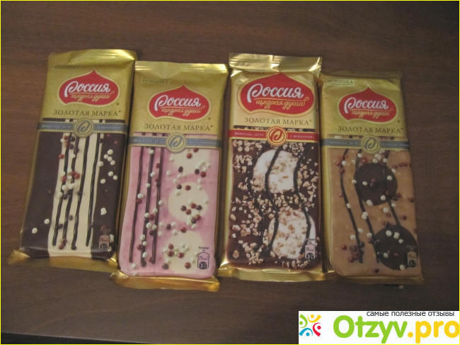 Шоколад "Дуэт" Золотая марка от известного бренда "Россия - щедрая душа" это новинка, представленная в 4-х видах с четырьмя различными вкусами.