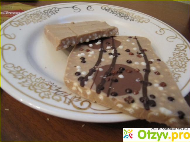 Очень вкусный получился дуэт - молочного шоколада с дробленым фундуком и кусочками бисквита (я бы даже назвала это "трио"). Плитка так же красиво декорирована. Вот так она выглядит на разломе