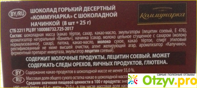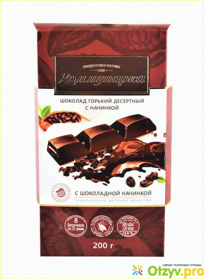 Производит шоколад горький десертный "Коммунарка" с шоколадной начинкой Кондитерская Фабрика "Коммунарка", которая расположенна в г. Минск, Белоруссия.