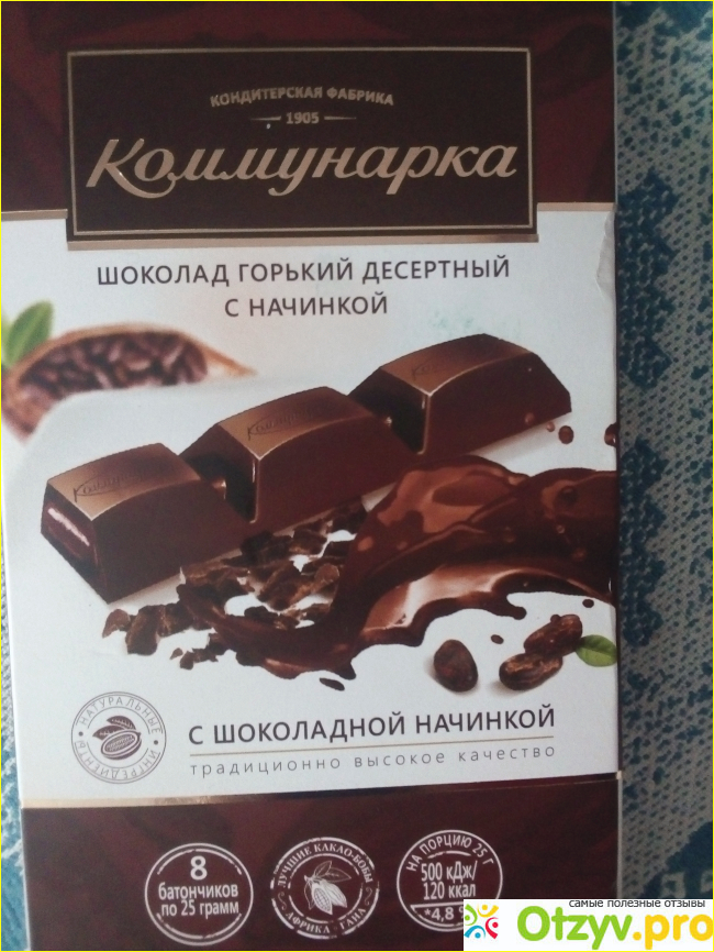 Объектом настоящего отзыва является шоколад горький десертный «Коммунарка» с шоколадной начинкой (8 шт по 25 г)
