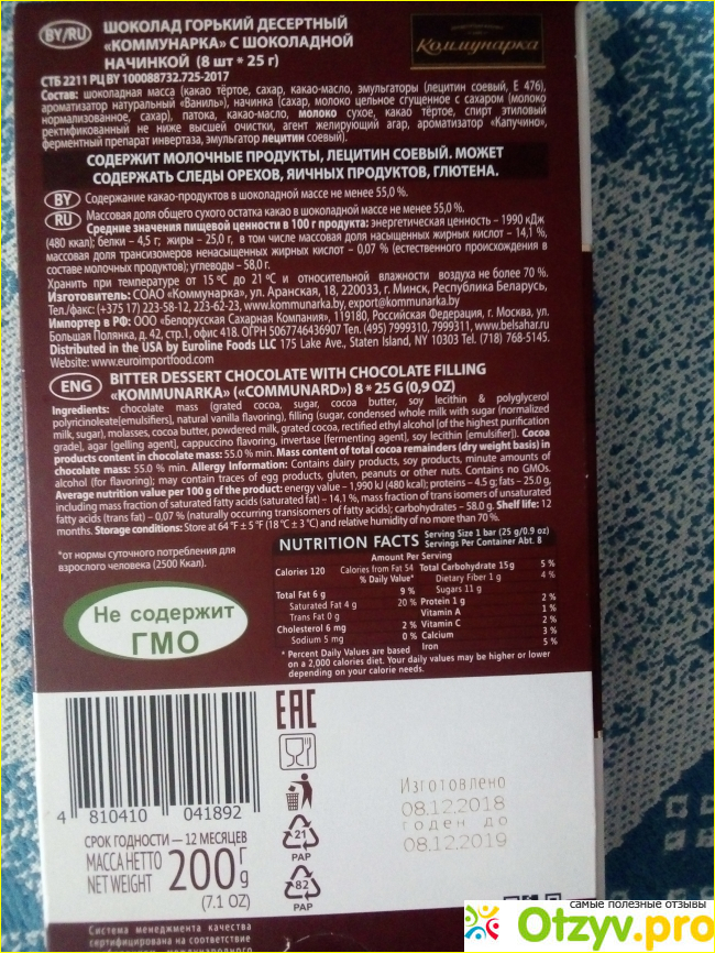 Также на коробочке имеется отметка, что продукт может содержать следы орехов, яичных продуктов, глютена. Эта информация также для аллергиков. Прокомментируем эту надпись. Дело в том, что производитель выпускает продукцию партиями: на одной и той же линии выпускается и молочный шоколад, и шоколад с орехами, и горький шоколад – объект нашего исследования.