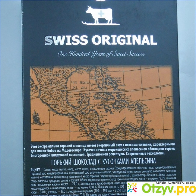 Даже не глядя на состав, обозначенный на упаковке, я поняла, что с цитрусовым вкусом здесь что-то не так. А когда прочитала информацию для потребителей на обратной стороне упаковки, то убедилась, что это не настоящие кусочки апельсина, а смесь яблочного пюре, грушевого и апельсинового соков и еще ряда ингредиентов, включая ароматизатор "Апельсин". Если честно, то от швейцарского шоколада, изготовленного по традиционной рецептуре, я ожидала большего, а если точнее, то исключительно натуральных ингредиентов. А тем, кто не слишком любит горький шоколад, лучше воздержаться от покупки шоколада Swiss Original с кусочками апельсина, так как "цитрусовый наполнитель" не делает его мягче.