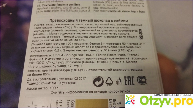Шоколад темный, содержание какао не менее 47 %. Темный я люблю, а вот молочный для меня сладковат. А тут еще и пикантная горчинка зеленого лайма. Мммм...
