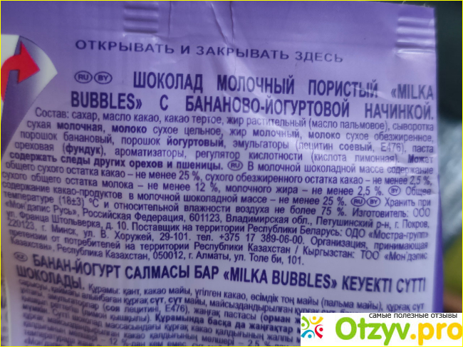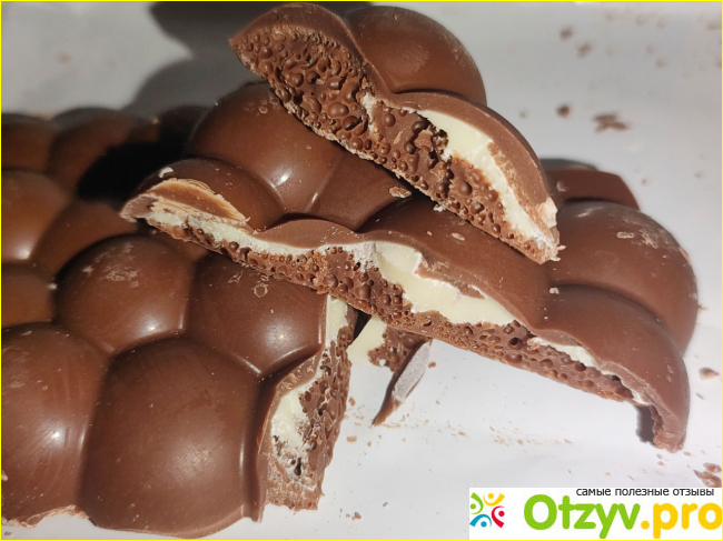 Аромат сладкого банана, какао не слышно. Нижняя часть конфеты это воздушный шоколад. Затем банановая начинка разной толщины, да и присутствует она не везде. В краях её может не быть. Сверху слой глазури. Молочная.