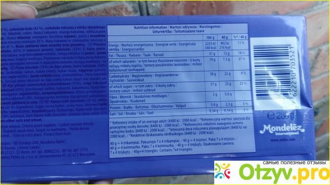 Энергетическая ценность тоже указана на упаковке, и каллорийность шоколада высокая.
