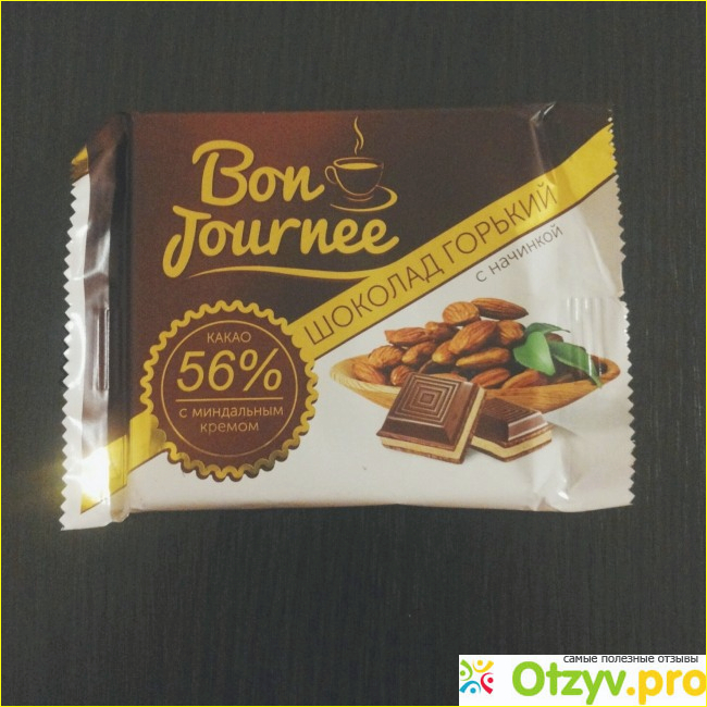 Итак, шоколад называется Bon journee. В магазине я видела два вкуса, но попробовала только тот о котором вам сейчас пишу отзыв - это горький шоколад с начинкой миндальный крем.