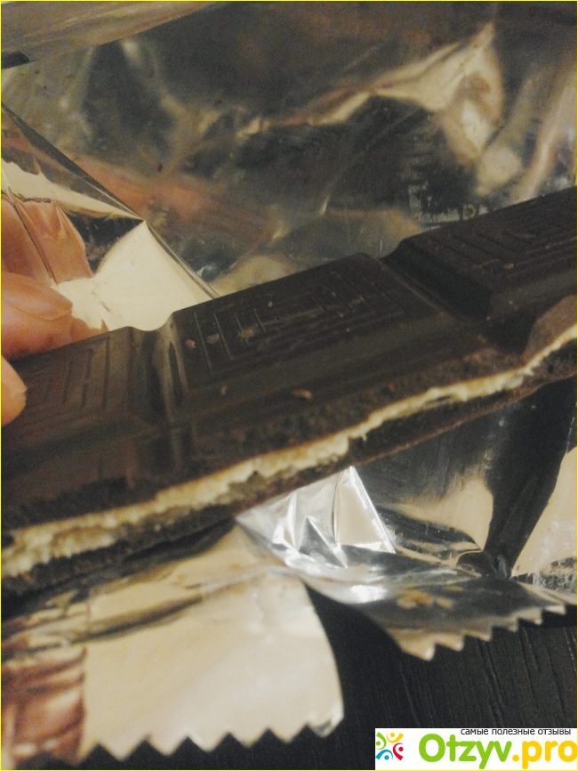 Прослойка внутри продукта вкусная и сладкая, но за счет того, что шоколад горький, когда ешь шоколадку, то всё вместе создает в меру сладкий вкус не приторный.