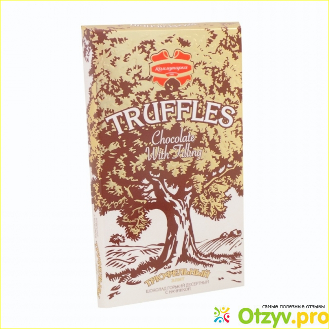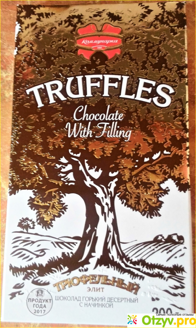 Добрый день! Как то, купила шоколадку Трюфельный элит шоколад, Коммунарка (страна производитель Беларусь) в магазине «Пятёрочка» за 149 рублей, решила попробовать. Конечно, привлек внимание красивый дизайн картонной упаковки шоколада, в центре упаковки красуется золотисто коричневое дерево вверху знаменитый логотип «Коммунарка», шоколад горький с десертной начинкой.