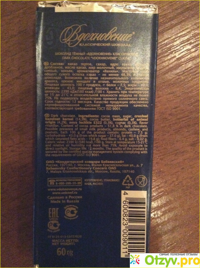 Перед Вами фотографии 60-ти граммовой плитки шоколада, но это один из предложенных производителями видов. Калорийность данного продукта на 100 грамм составляет 579 килокалорий. А, просмотрев составляющие компоненты, я обнаружила там коньяк. Вот-так вот)) И массовая доля сухого остатка какао в шоколаде "Вдохновение" - не менее 53,2% в самой массе. Это круто, ведь многие недобросовестные производители занижают, прямо скажем, этот процент.