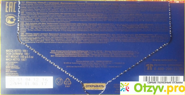 Конечно, как и всякий другой шоколад, который выпускается в современном мире, эта вкуснятина тоже не без "капельки дегтя" в виде ароматизаторов. Есть здесь и эмульгатор Е 471. Хотя именно этого сочетания Е не стоит опасаться - он абсолютно натурального происхождения и получен из растительных кислот. Этот Е помогает соединить входящие в состав кондитерского изделия компоненты. То есть шоколад наш становится таким нежным и однородным благодаря именно этому эмульгатору.