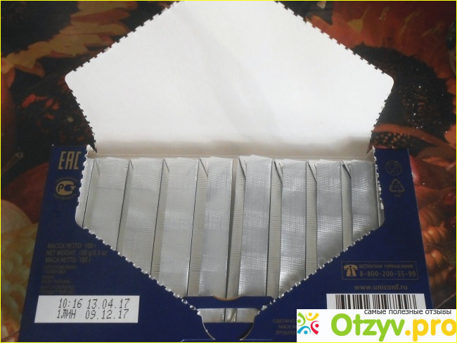 Как видим на фото, в ней находятся 10 шоколадных брусочков, завернутых в серебристую фольгу. Это тоже очень удобно, так как шоколад, если он вдруг подтает, не испачкает руки. Да и потребленные калории так считать проще. Съел один брусочек, значит, организм получил 57 килокалорий. Таким сладкоежкам, как я, обязательно надо контролировать количество потребляемых калорий, иначе можно сильно располнеть. Это не просто, когда держишь в руках упаковку шоколада "Вдохновение", ведь он очень вкусный, так и хочется брать брусочек за брусочком. Бесспорно, нужна большая сила воли, чтобы остановиться и не съесть все десять штучек сразу.