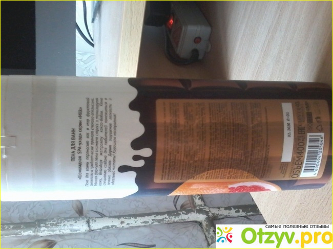 Купить ее уговорила меня моя дочка. Понятно я делаю соблазнила упаковка. На упаковке изображена плитка шоколада и грейпфрут. Я вообще люблю использовать различные средства для ванн. Это может быть и пена для ванн и гель для душа и различные масла. После того как мы купили эту пену Конечно мы ожидали что наверное она окажется шоколадного цвета. Судя по аромату действительно присутствуют нотки темного шоколада и некоторых фруктов. Есть конечно у этой пены и минусы. Например такие. Для того чтобы получить достаточное количество пены на одну стандартную ванну пришлось использовать достаточно много этого средства. Аромат конечно был. Но уже не такой ярко выраженный как в упаковке. Пена имеет обычный белый цвет. Никаких темных оттенков в ней не присутствуют. Из личного опыта я сделал для себя Вывод что такую пену лучше использовать в качестве геля для душа. Она отлично смывается струей воды. И на теле дольше остается аромат темного шоколада. Как такового конкретного состава на упаковке я не увидела. В основном было написано на английском языке. То что было написано на русском. Это протеины молока экстракт какао и экстракт апельсина. Остальные ингредиенты которые входили в состав были написаны на английском языке.