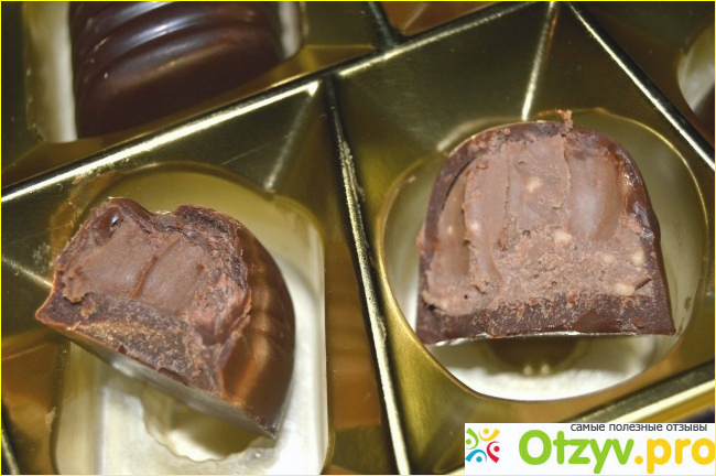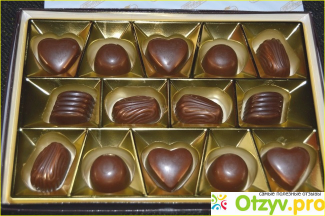 Внутри 14 конфет. У каждой своё индивидуальное место. Шоколад обещается молочный и горький. Подробнее:
