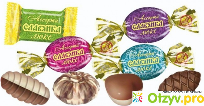 В данной линейке конфет от "Славянке" конфетки совершенно разные, поэтому они и называются ассорти, так как форма у конфет, внешний вид и вкусы отличаются. По внешнему виду конфеты такие обертки имеют - розовую, голубую, фиолетовую, зеленую - это те, которые я покупала и пробовала, возможно в этой серии конфет "Славянка Люкс" ассорти есть и другие, но я не встречала больше никаких, только вот такие, как на фото.