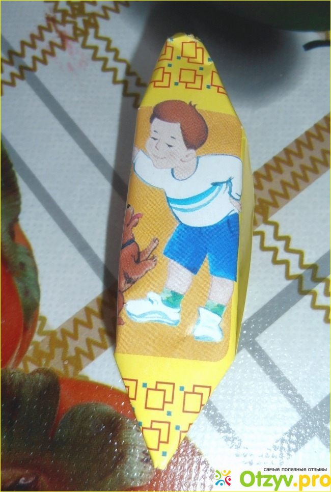 Оформлены простенько, чем-то напоминают советские открытки или иллюстрации из детских книжек моей сопливой молодости. Стиль исполнения рисунка уж очень простой, какой был в те времена. Обертка имеет желтый цвет, на ней изображен, видимо тот самый хлопчик, который дразнит милую собачку. В общем, все просто, но мило. Мне нравится оформление.