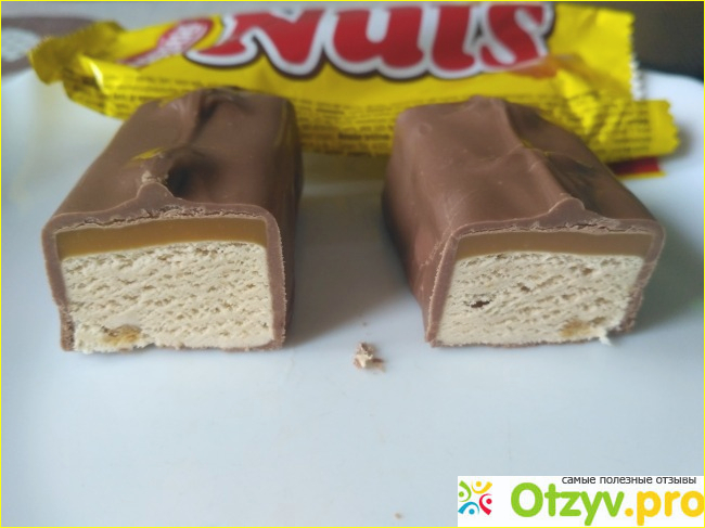 Сверху батончик покрыт шоколадной глазурью. А внутри карамель с мягкой нежной нугой. Батончик буквально тает во рту, я наслаждаюсь этим вкусом. Имеет запах ореховой пасты. Вот так выглядит этот десерт в разрезе.