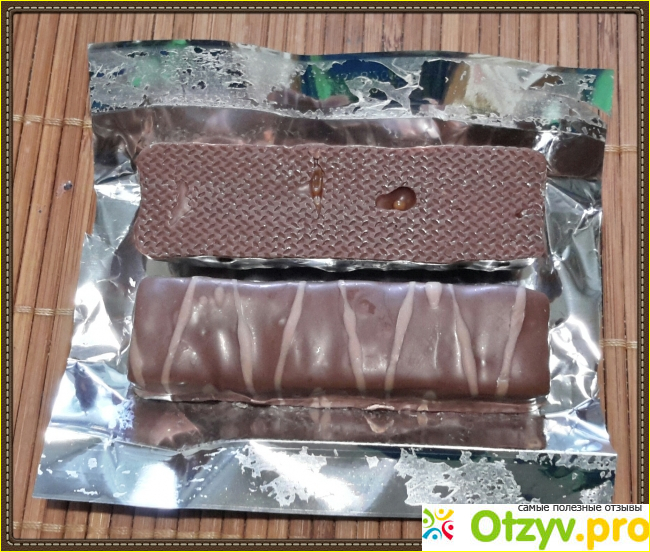На момент покупки десерт был свежайший. Конечно же, я уже попробовала такие лакомства. Обёртка фольгированная. Батончики классический формы, это высокий, вытянутый прямоугольник. Со всех сторон равномерно покрыт молочной шоколадной глазурью.