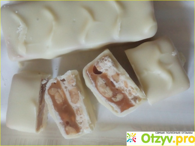 Белый шоколад отличается сильной сладостью, что и делает этот батончик более сладким, от привычного знакомого батончика. В шоколаде хорошо ощущается вкус сухого молока.