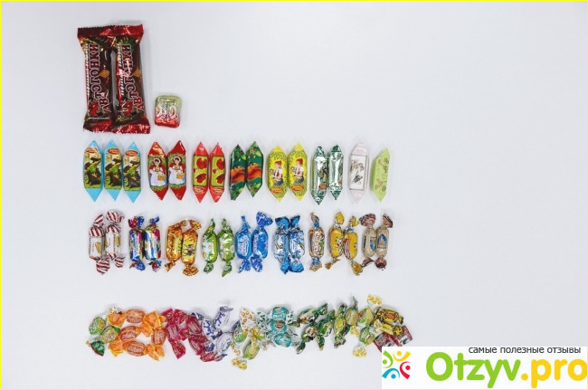 Мишки на в лесу, конфеты и вафли Аленка, вафли Артек, холва, Батончики "Автогонки", Белочка, Красный мак, Красная шапочка, Мальвина , золотой петушок, Мягкий грильяж, варьете, мятные, желейные, молочная коровка, снежок, мечта, карамельки всякие и ириски. Шоколадных по две штучки.